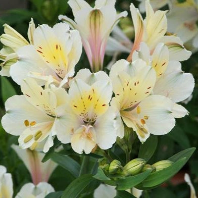 Alstroemeria 'Summer Sky' is an upright, clump-forming, tuberous perennial with narrowly lance-shaped, dark green leaves and, from early summer into autumn, clusters of funnel-shaped, white flowers with brown-flecked, yellow-marked upper petals.