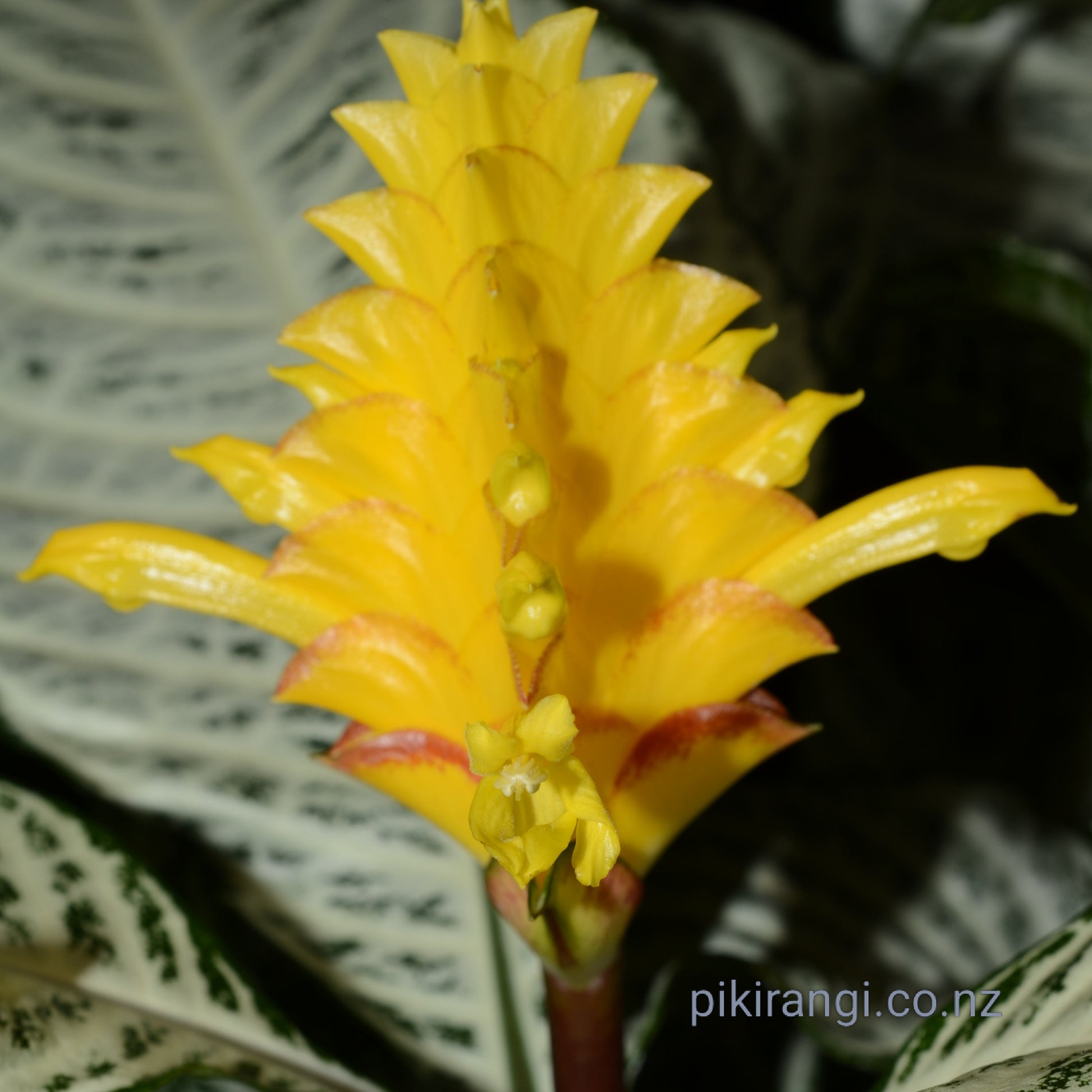 A compact tropical evergreen shrub, usually grown as a houseplant. Long ovate leaves are dark green with white veins and a white 'wash', which on some plants can make the foliage look almost entirely white. Terminal spikes of waxy-yellow flowers may be borne sporadically but are rarely produced. W 0.5-1m x H 0.5-1m.