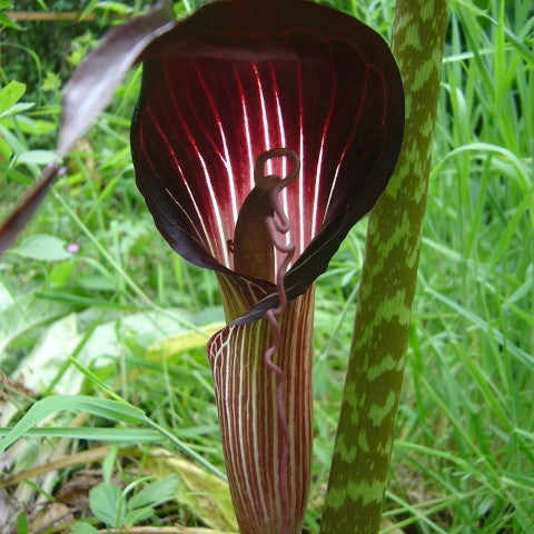 Arisaema speciosum is a bulbous perennial native to the greater Himalayan region from Nepal, through Sikkim, Arunachal Pradesh and the northern part of West Bengal in India, to Bhutan, Southern Tibet, Northern Myanmar and the Gaoligongshan area of Yunnan, China. It grows in warm temperate monsoon forest at elevations up to 3,500m.
