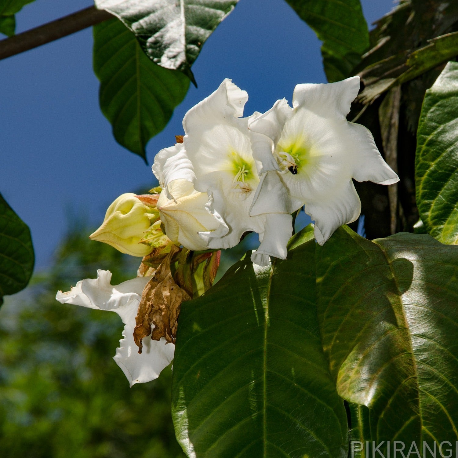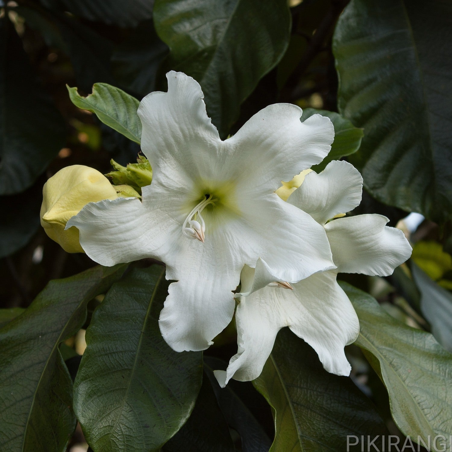 Beaumontia grandiflora, the Easter Lily Vine, Herald's Trumpet, or Nepal Trumpet Flower, is a species of flowering plant in the family Apocynaceae. It is native to the eastern Indian Subcontinent, southern China, and mainland Southeast Asia, and has been introduced to a number of locales in Central America. This is one of the most beautiful vines you can find. The large off-white flowers and breathtaking and highly fragrant. Frost tender when young.