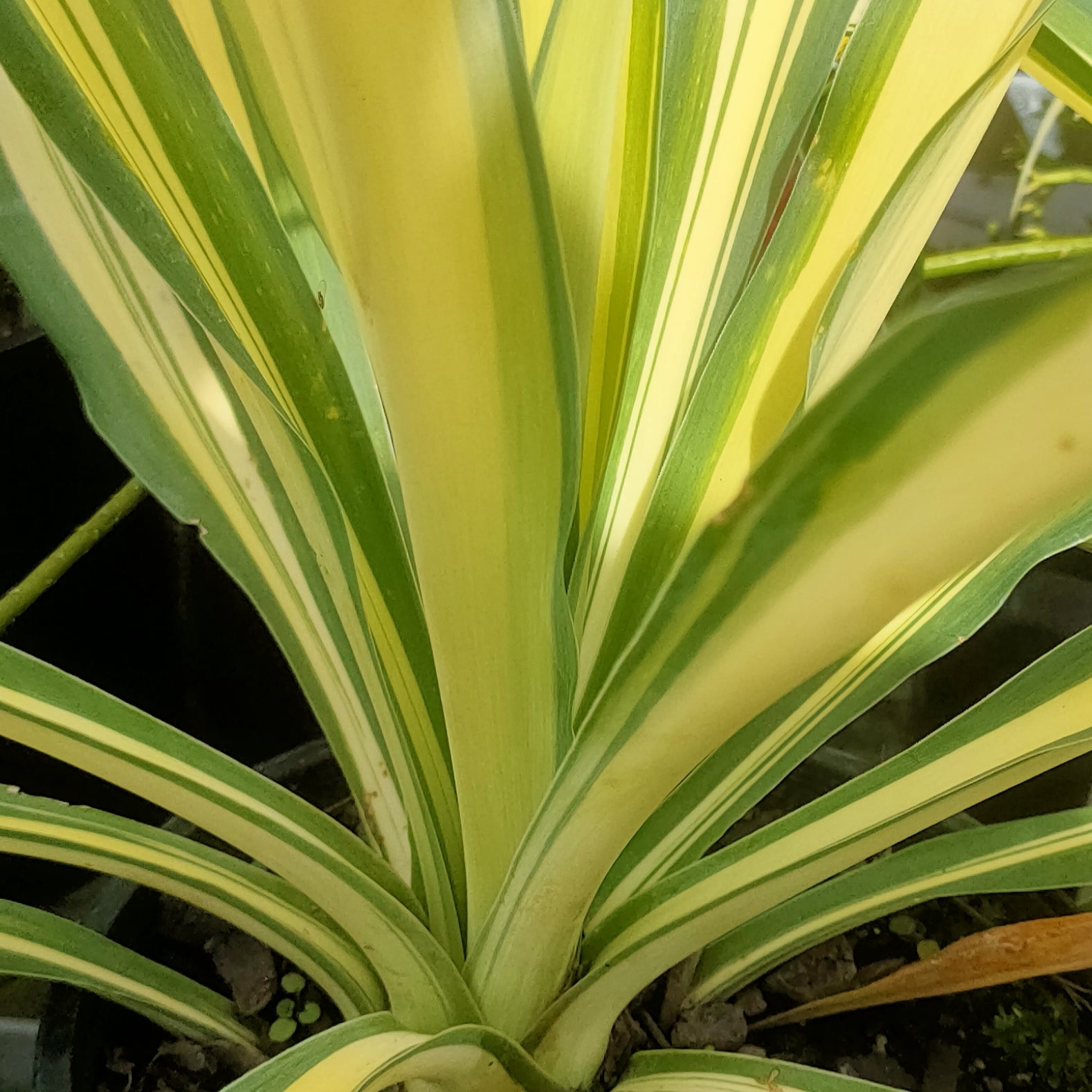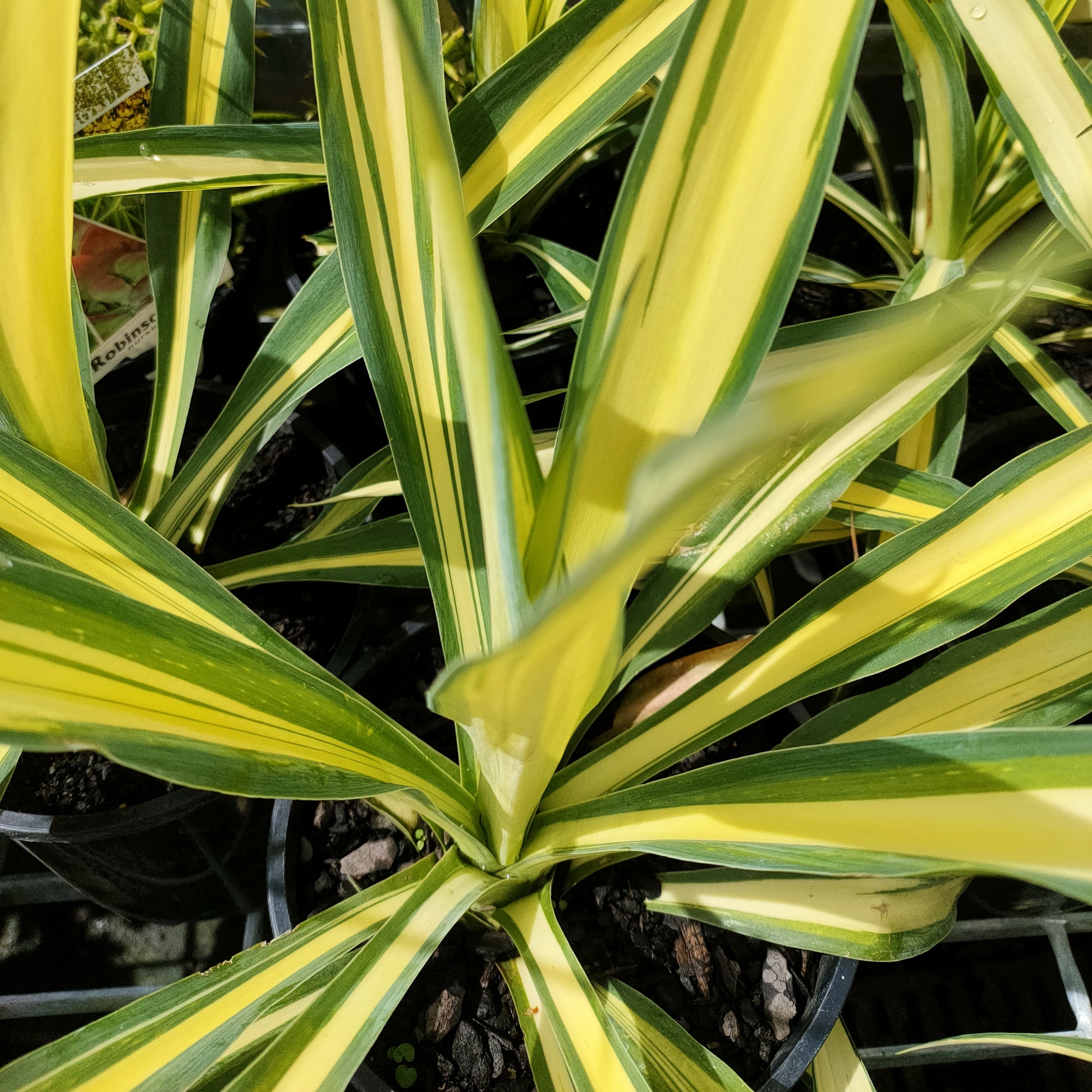 The variety 'Flamingo Glow' has leaves with yellow central stripes, and in Summer on mature plants, pink to reddish-pink stems bearing panicles of tubular, yellow-green flowers with prominent pink to red bracts. Grows to 1.5m high and 1m across.