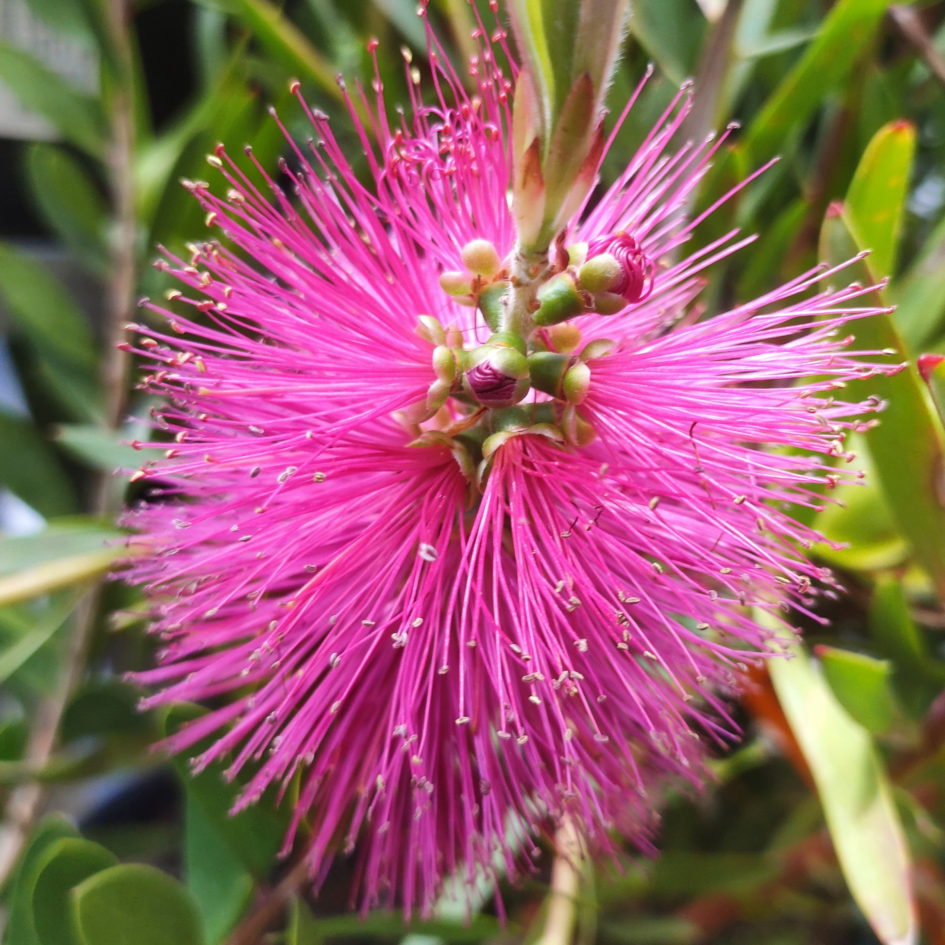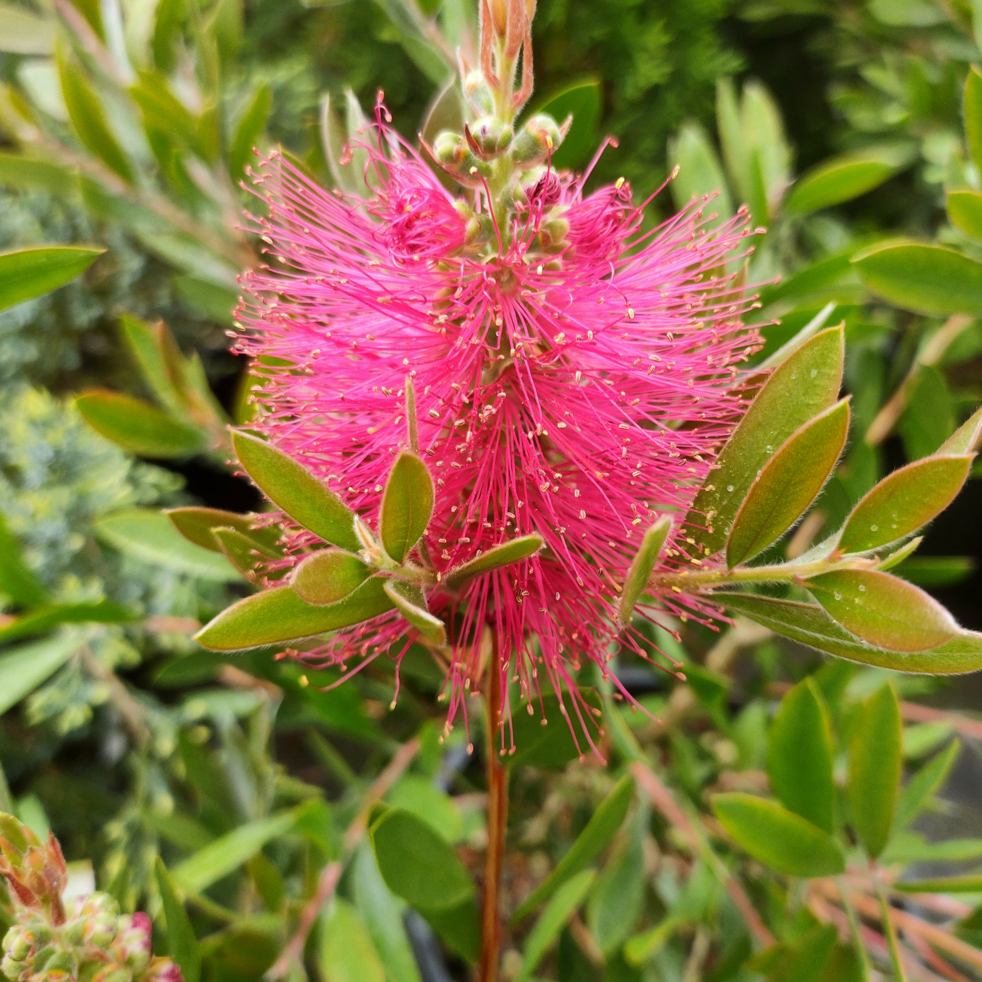Callistemon 'Hot Pink' is an evergreen spreading shrub and produces large, bright pink, brush-like flowers during the spring season. Its flowers are attractive to nectar-feeding birds, and is tolerant to both drought and coastal conditions. This plant is a hybrid between Callistemon citrinus 'Splendens' and Callistemon pallidus and was bred in South Africa. H 4m and W 3m in about 10 years.
