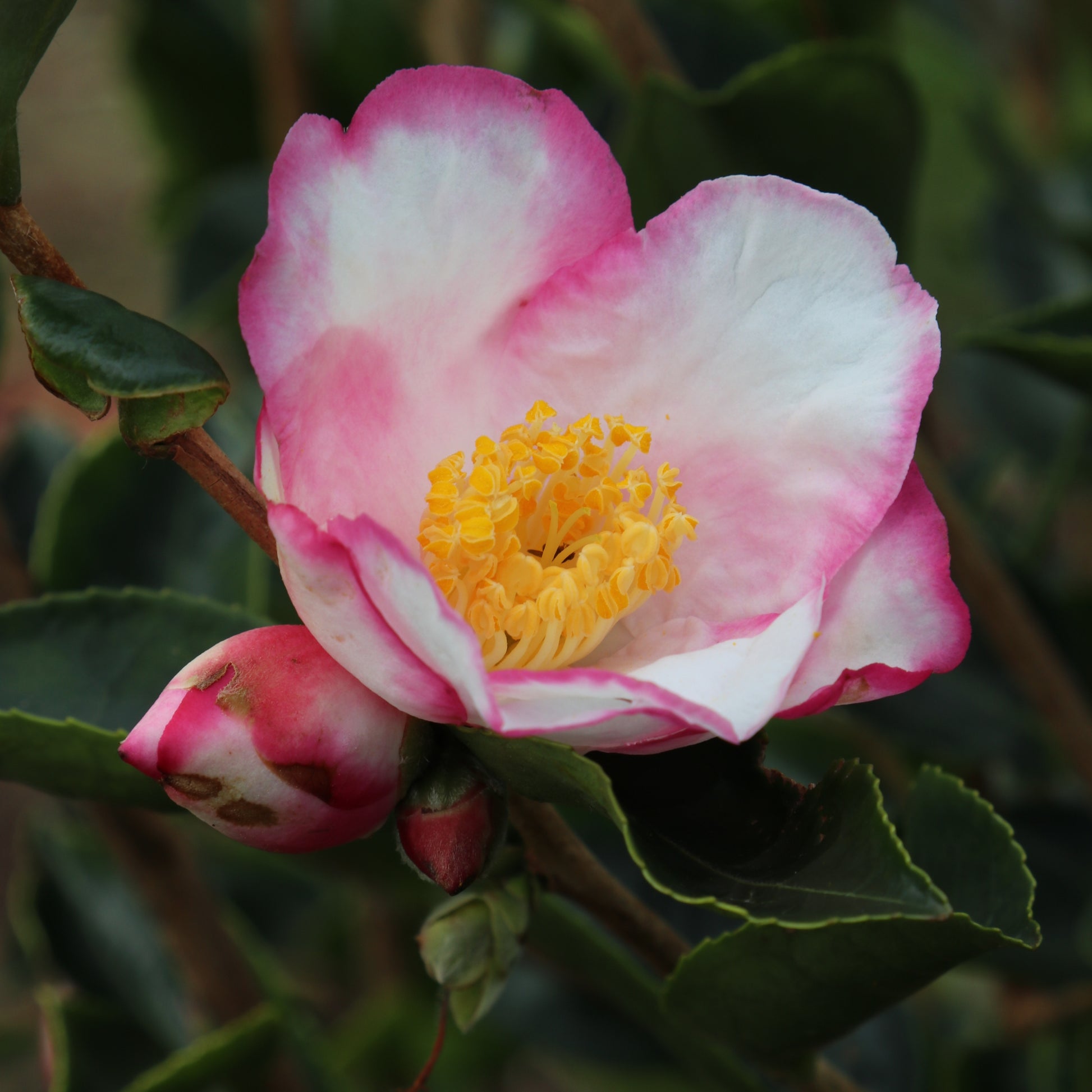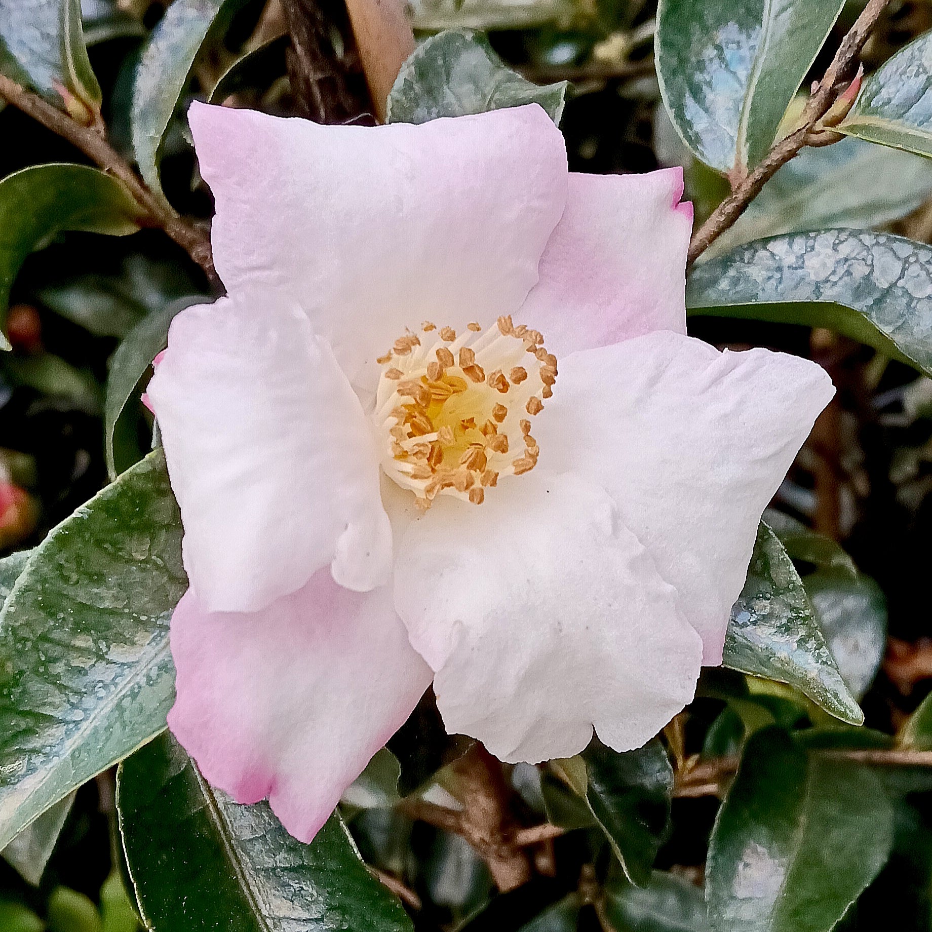 A hybrid camellia with medium sized single white flowers tinged pink with pronounced yellow stamens. Flowering occurs in June. Leaves are ovate leathery and mid to dark green. H 2.5m x W 2m.