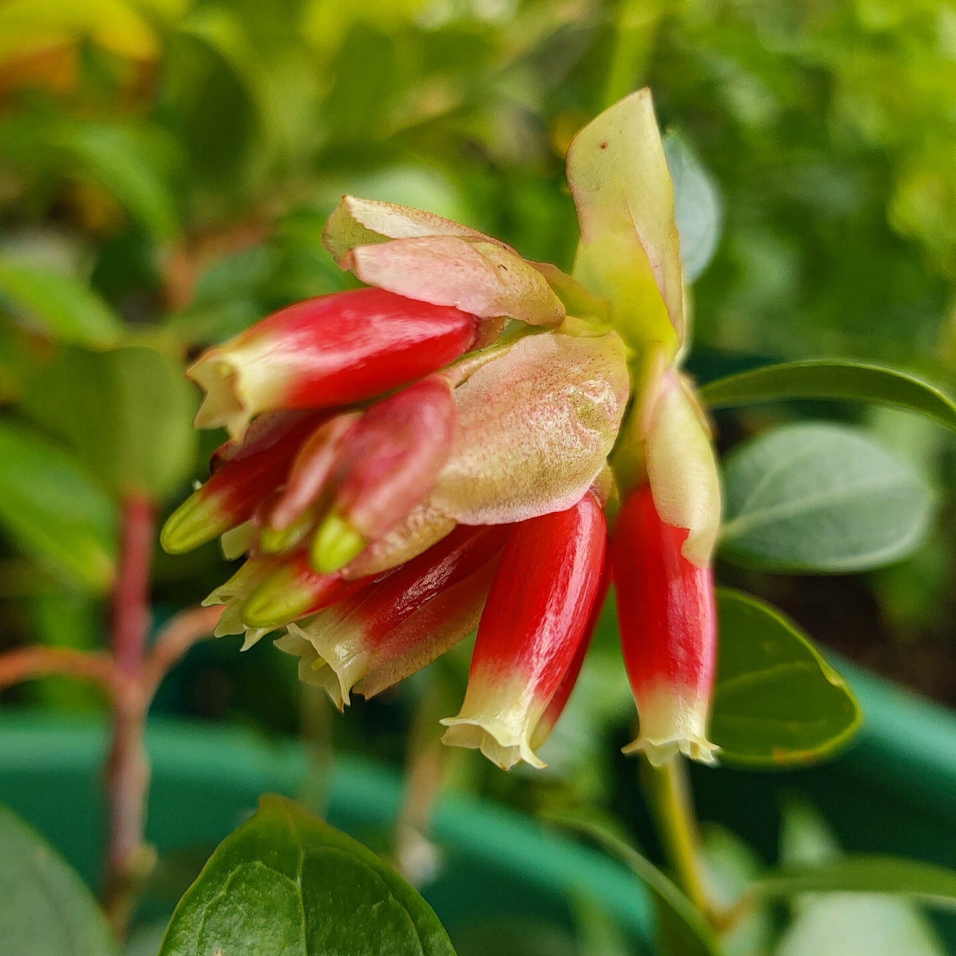Woody-based shrubby perennial from the tropical mountainous areas of South America, where it usually grows as an epiphyte. Will eventually form a bushy shrub to around 1m by 1m, with glossy green leaves and the new foliage has gorgeous autumn hues. Clusters of tubular-bottle shaped waxy red flowers with white tips appear for much of the year. Does best out of the glare of hot summer sun, so part shade is best.