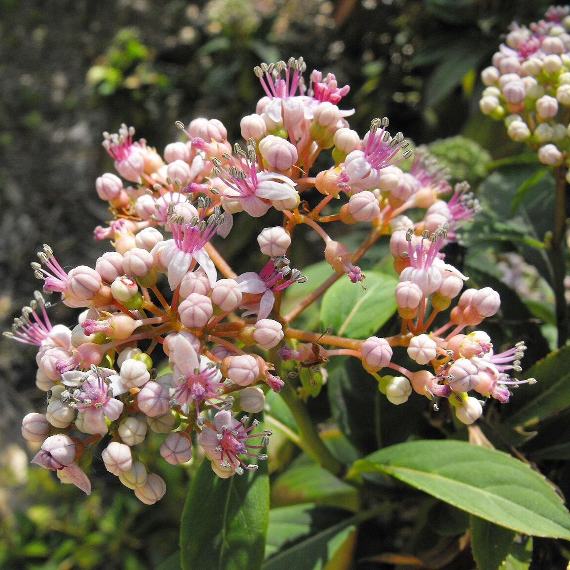 An evergreen member of the hydrangea family from China. Reasonably hardy tolerating full sun or shade. Favorably flowers all year, unlike a traditional hydrangea that has a seasonal bloom. Prune long growth every so often to avoid it getting too big rather than harshly pruning it all right back. We grow ours under Nikau palms in free-draining peat soil, where it is quite happy at about 2.5-3m+.