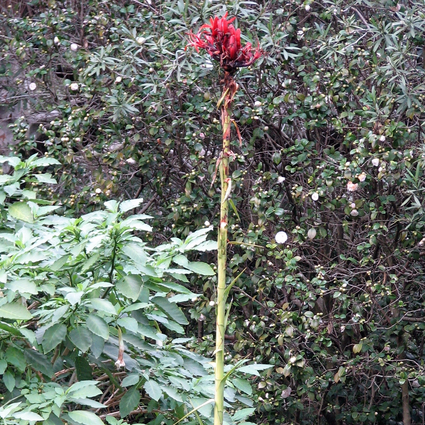 Doryanthes excelsa, commonly known as the Gymea Lily, is a flowering plant in the family Doryanthaceae that is endemic to coastal areas of New South Wales near Sydney. It has sword-like leaves more than 1m long and it grows a flower spike up to 6m high. The apex of the spike bears a large cluster of bright red flowers, each 10cm across. Its common name is derived from the name given to the plant by the indigenous [Dharawal] people. The Sydney suburbs of Gymea and Gymea Bay are named after the lily.