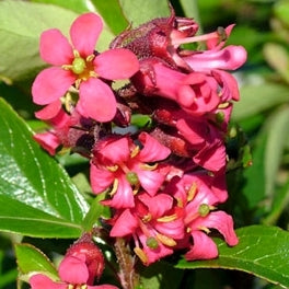 Renowned for its attractive foliage and quaint flowers. Lush and glossy, green leaves give way to showy clusters of red-pink flowers through spring and summer. Commonly included in a mixed planting, used as a backdrop for smaller plants, included in cottage gardens, planted around outdoor living areas, or trimmed into a hedge. H 2m x W 2m.