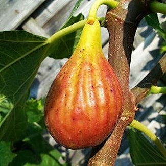 'Brunswick' is a large, deciduous shrub with bold, very deeply-lobed leaves and large, purple-flushed, green, pear-shaped fruit. The fruits are sweet with good-flavoured amber flesh. Usually one crop of fruit per year, but sometimes two in a hot summer or under protection. Light first crop in summer with the second main crop in autumn. Cold hardy and reliable. Mature height 2.5-5m tall and 2.5-4m wide, which will be between 10-20 years. Requires a moist, but well-drained soil. Best grown in a sheltered area.