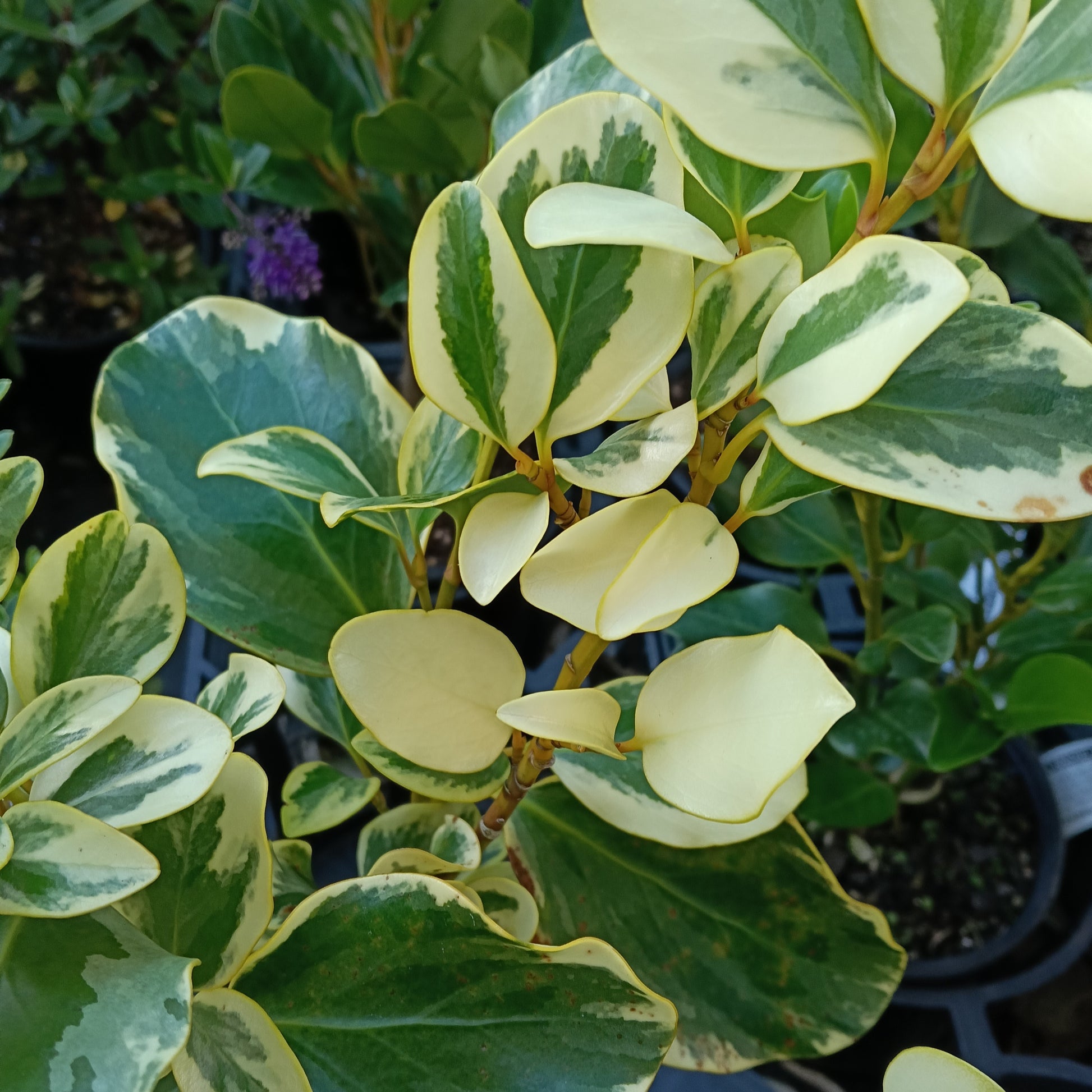 Griselinia littoralis 'Variegata' is grown for the beautiful, oval-shaped, mid-green leaves which finish with an uneven, cream margin. A nice, upright shrub which, when grown as a specimen, can also be clipped into a hedge, topiary or standard. Positioned in full sun to part-shade it will tolerate strong winds and coastal conditions. Plant in well-drained soil. H 2.5m x W 2.5m.