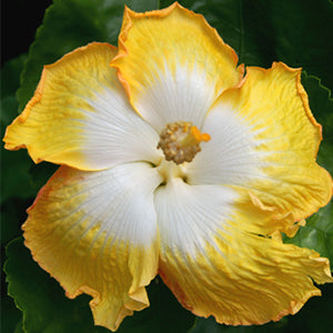The Hibiscus rosa-sinensis 'Saffron' offers unique foliage and flowers with striking, deep red petals. It is a fast-growing medium shrub that is perfect for creating a colorful statement in any garden. Its glossy leaves and large, 17cm wide blooms help make this plant one of the most eye-catching varieties of hibiscus.