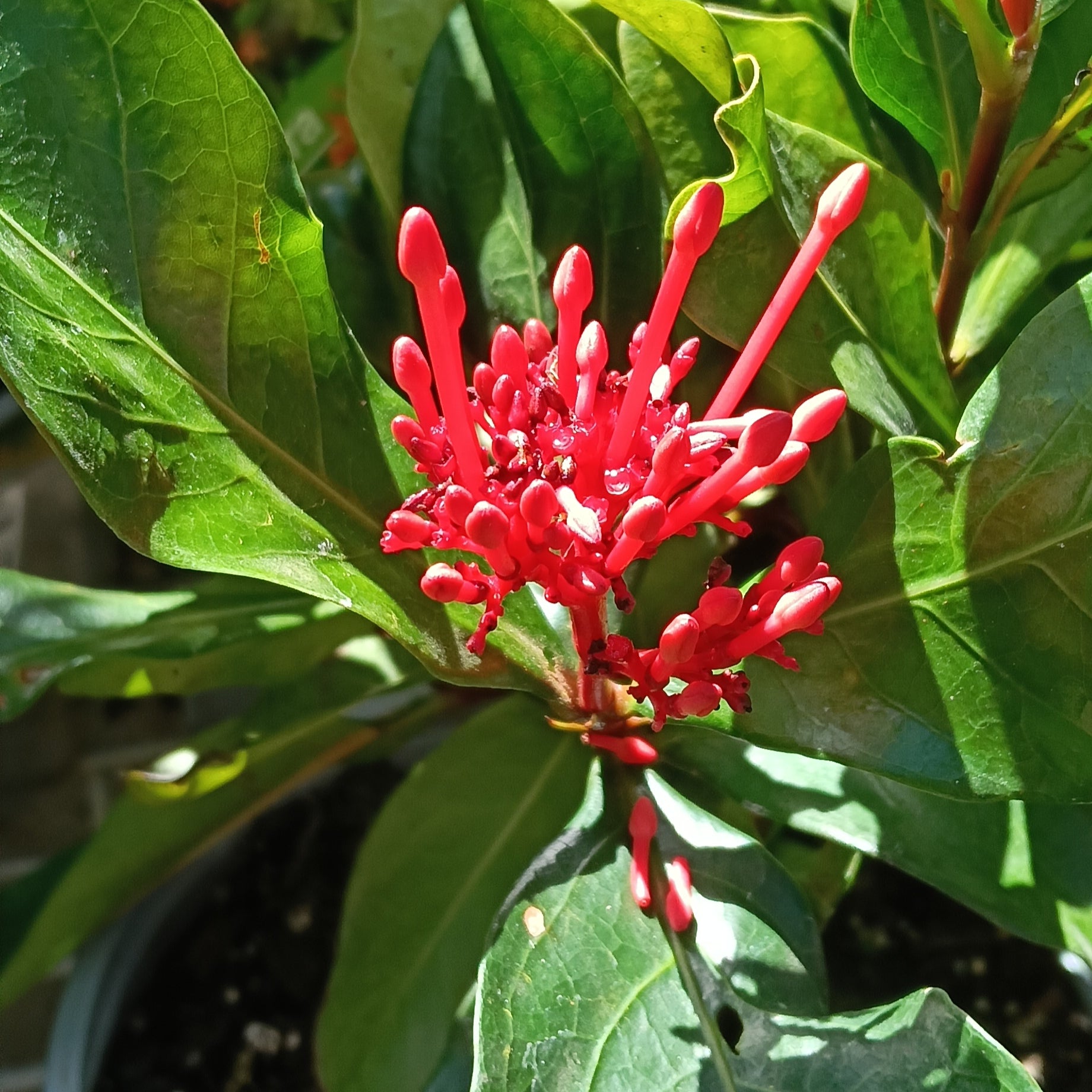 Ixora coccinea is a species of flowering plant in the family Rubiaceae. Commonly known as Jungle Geranium, Jungle Flame or Flame of the Woods). It is a common flowering shrub native to Southern India, Bangladesh, and Sri Lanka. It has become one of the most popular flowering shrubs in South Florida gardens and landscapes. It is the national flower of Suriname. The plant can form a small tree up to 4m tall in the wild. This tight, compact shrub is much branched and tolerates hard pruning, making it ideal for formal hedges, although it is at its best when not sheared. H 1.2-1.8m x 1.5-2.5m.
