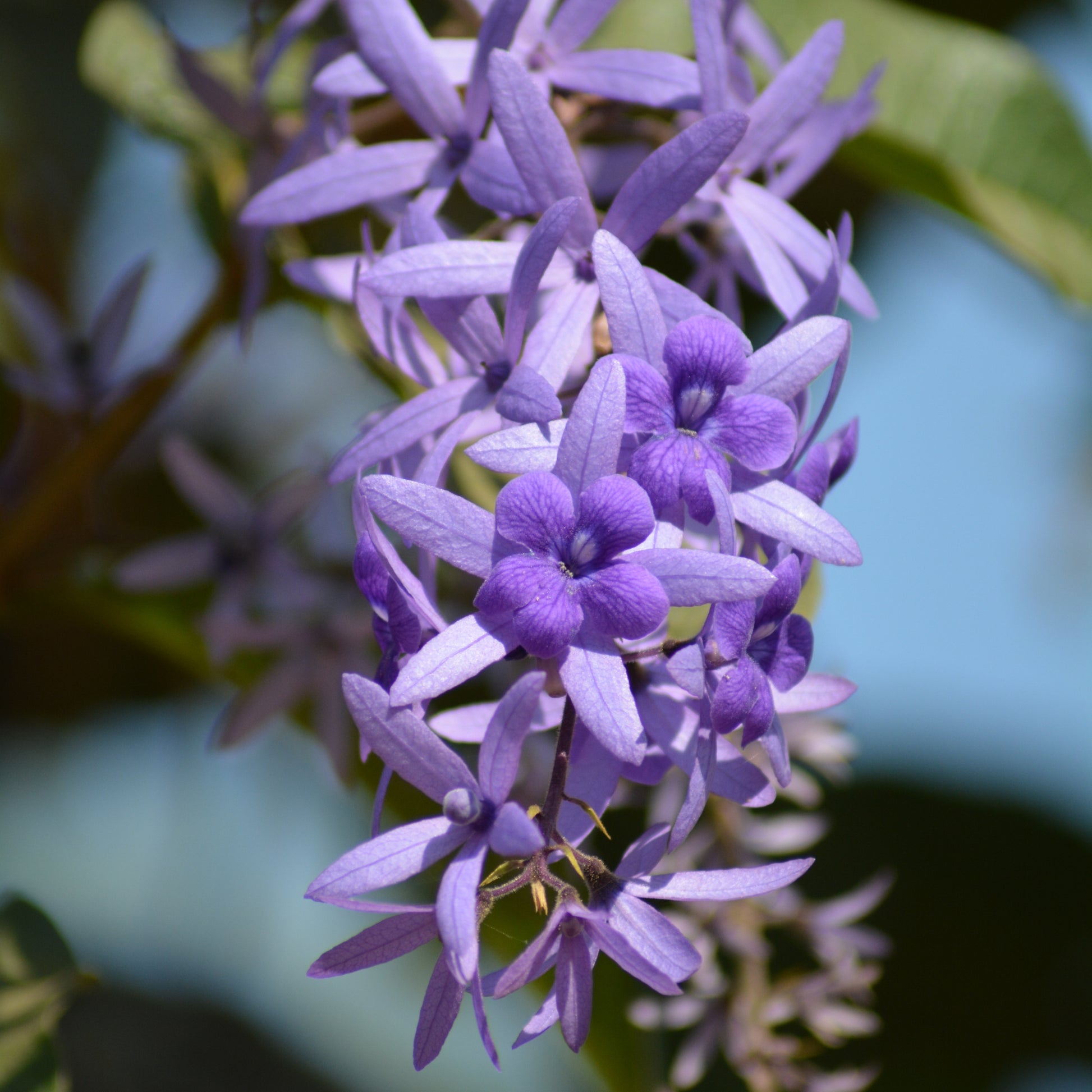 Petrea volubilis, is an evergreen shrub with a highly-sought after flowering quality. The fragrant, star-shaped blue-purple flowers bloom between June and September and boast a unique soft, silvery appearance. The plant features a thick, glossy foliage and trailing shoots that make for an attractive addition to any garden.