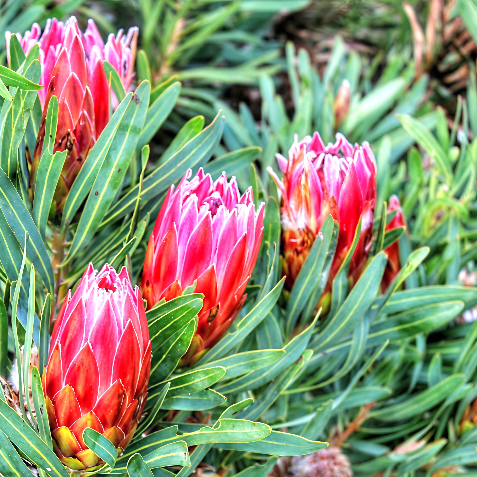 Protea neriifolia 'Red Ice' is a stunning variety of the South African flowering plant that brings a unique, vibrant color to gardens. Blooms are a deep shade of red with an icy crystalized center, making Protea 'Red Ice' a stand-out addition to any landscape. Grows to 2.5m tall and 2.5m wide.