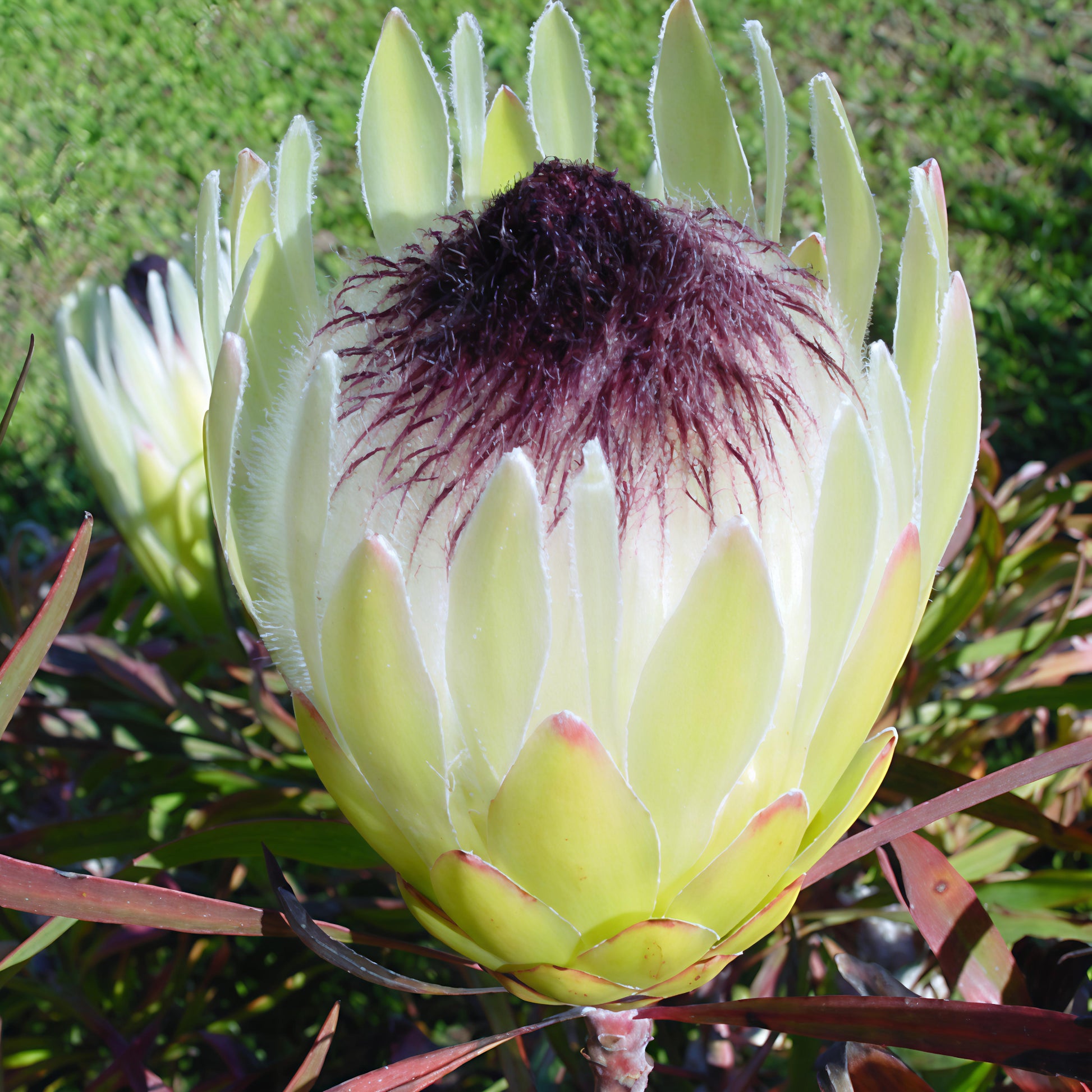 Protea longifolia (Long-leaf Sugarbush) is a hardy evergreen shrub which has an erect spreading growth habit. Produces large flower heads with creamy yellow outer bracts and the white flower mass topped a prominent black tip. Peak flowering is during Winter. Plant in free draining acidic soils in an open sunny position. Provide one substantial watering per week during the first Summer or in periods of prolonged dryness after planting to help the plant establish. Drought tolerant once established. Prune back well after flowering to shape and size and this is also ensure good flowering the following year. Avoid fertilisers. An excellent plant for coastal gardens and flowers are useful for floral work. H 1.5m x W 2m.