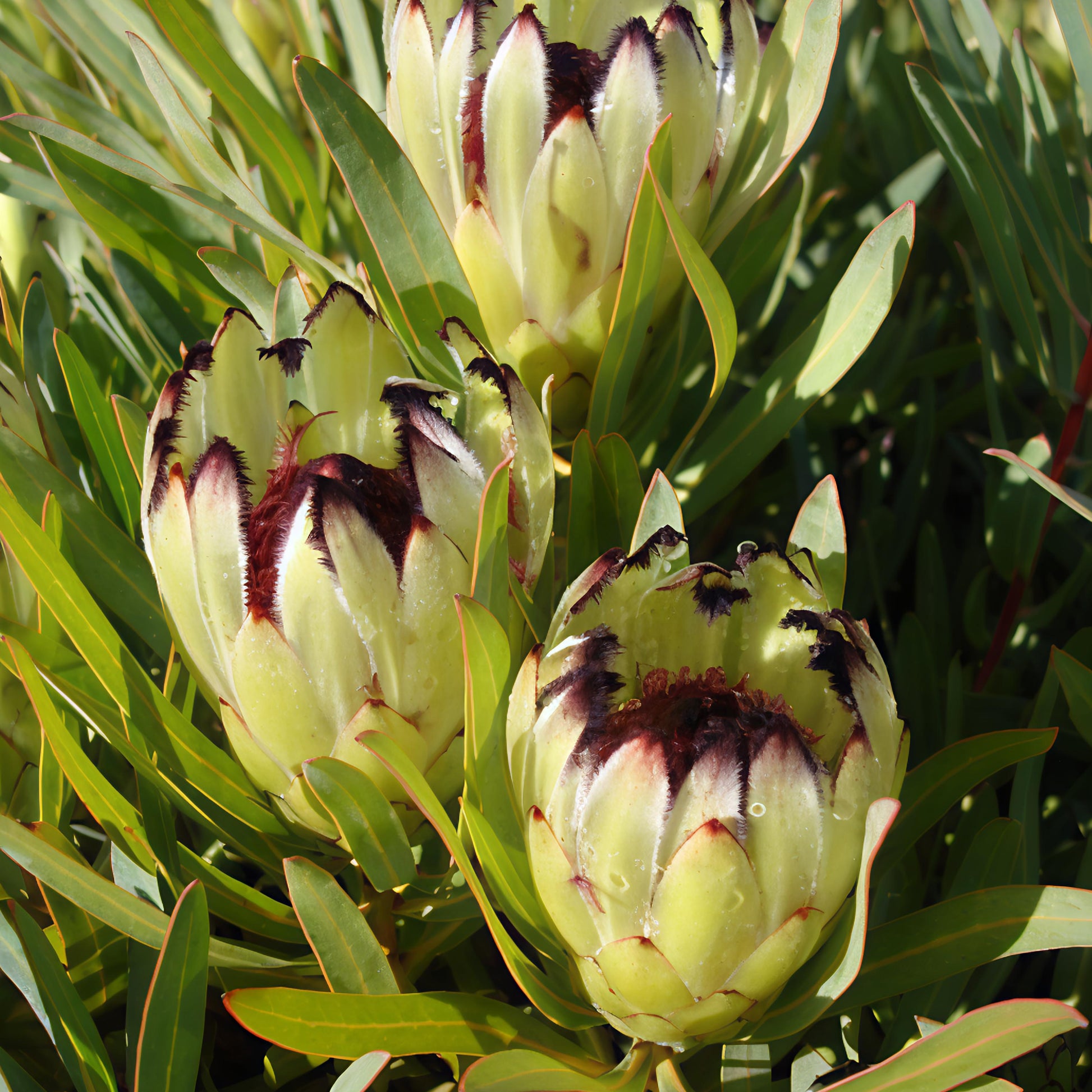 A select Protea form developing into a nice rounded shrub. The attractive lime green bracts surrounded by maroon beard develop in Winter. Likes an open sunny situation in an acidic free draining soil. Coastal tolerant and is a great cut flower. H 1.5m x W 2m.