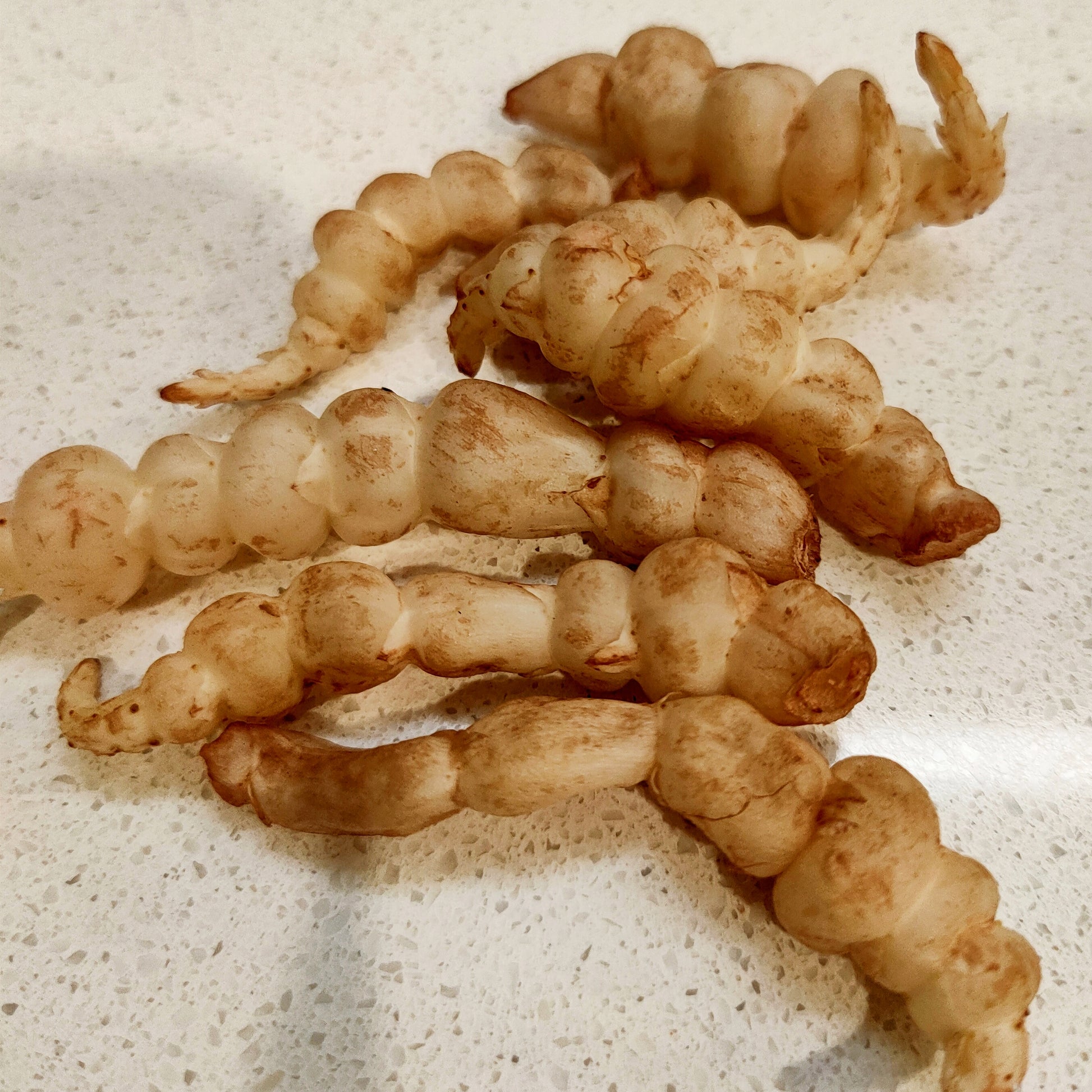 Stachys affinis, commonly called crosne, Chinese artichoke, Japanese artichoke, knotroot, or artichoke betony. The plant is a perennial herbaceous from the mint family Lamiaceae, originating from China. Its rhizome is a root vegetable that can be eaten raw, pickled, dried or cooked. The raw tubers taste a bit like fresh apples. The rhizomes are dormant in Autumn and Winter. Expect growth in mid Spring.