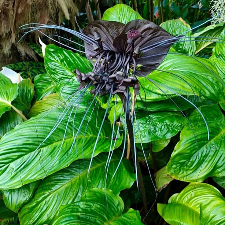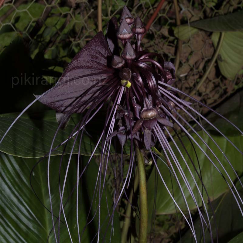 An erect, rhizomatous herbaceous perennial up to 1m high, with oblong or lance-shaped leaves, 17-55cm long, dark green above and paler beneath, and leafless flowerstalks up to 65cm high topped by green, brown or black bracts surrounding umbels of flowers which have five green petals and dark green, maroon or black thread-like appendages, 25cm long, in summer. [batflower]
