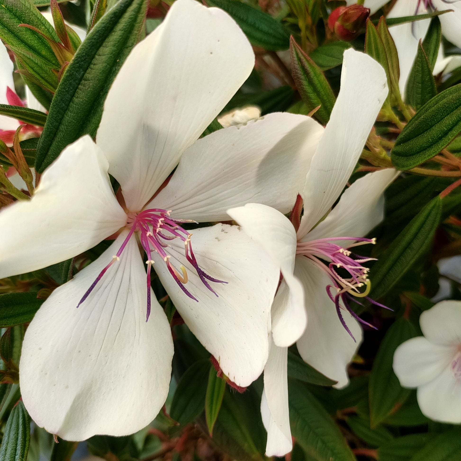 Tibouchina 'Peace Babyβ is one of the most compact forms of Tibouchina currently available. Very large, clear white flowers with pink stamens throughout the warmer months of the year. Trim to keep it compact. Requires full sun. Mature size about 60cm.