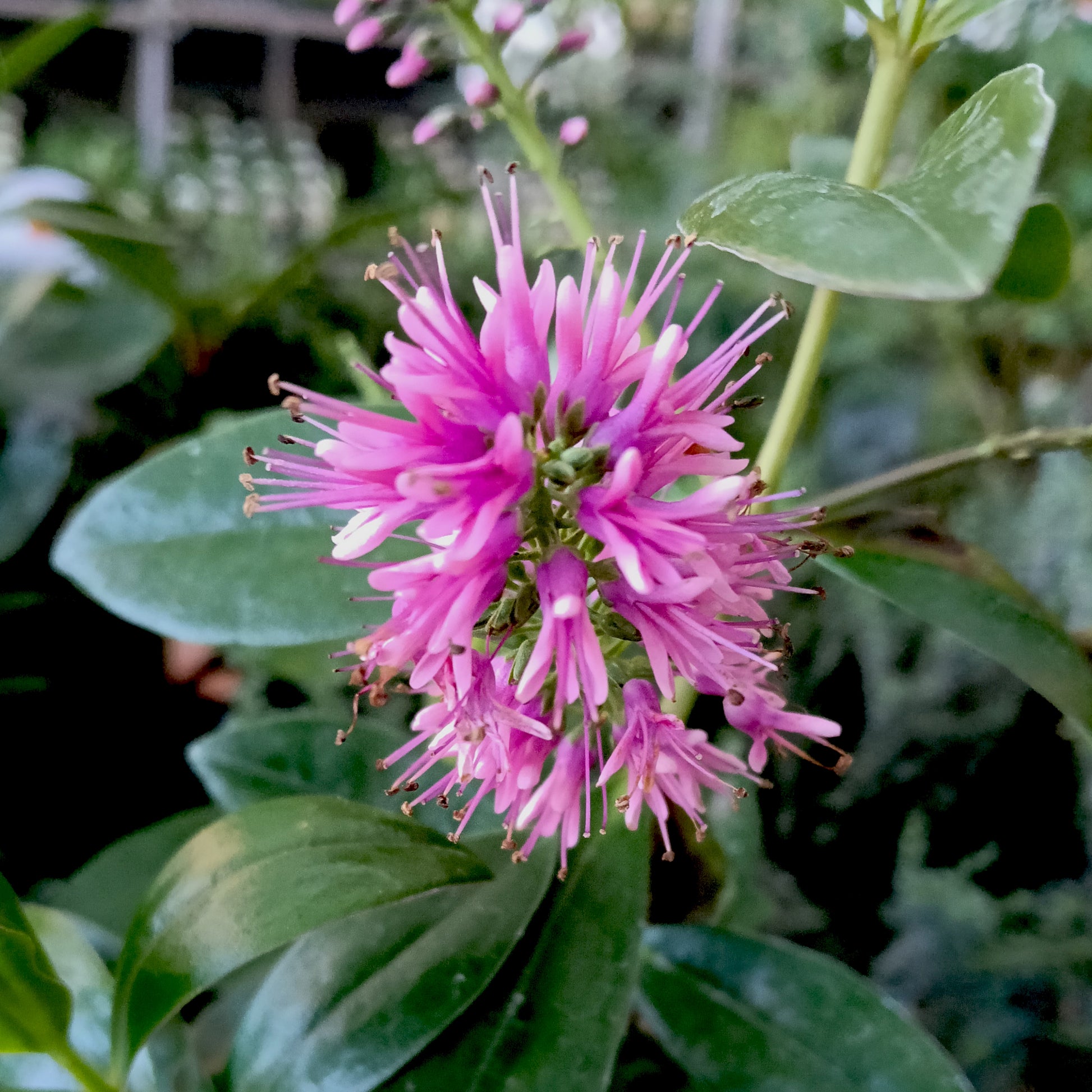 A bushy shrub with broad dark green glossy leaves. Large spikes of rich pink flowers in summer and autumn. It will grow in sun or semi-shade, best in well drained soil, will grow in dry sites. Grows in exposed and coastal sites, and will always look best in these conditions. H 1m x 1m.