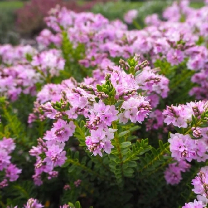 A compact, evergreen shrub with a neat habit and small, glossy pale green foliage. Short racemes of pale, shell-pink flowers appear in early summer. The hardiest pink-flowering variety