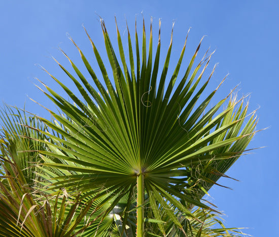 The fronds are bright green, and almost circular in shape, borne on a tapered trunk. When the old fronds away, the grey trunk is revealed with close leaf scar rings. Suitable for coastal planting. Hardy, and grows to over 8m tall.